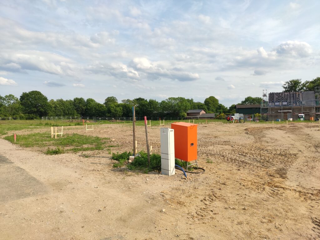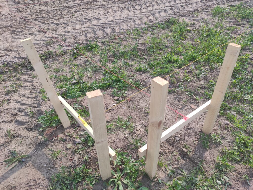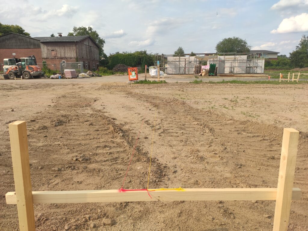 Heute Nachmittag war ich erneut am Grundstück und siehe da: Der Bagger war weg, die Seile waren gespannt, und das Schnurgerüst endlich komplett!
