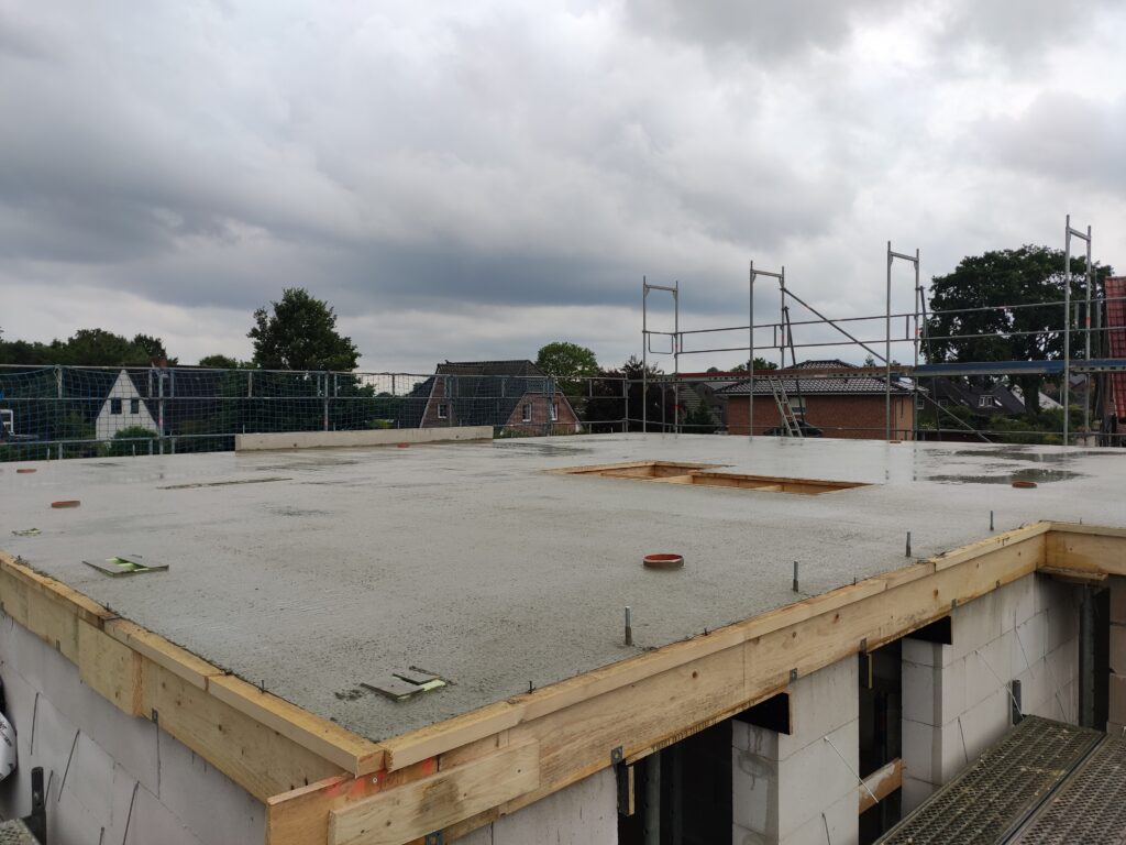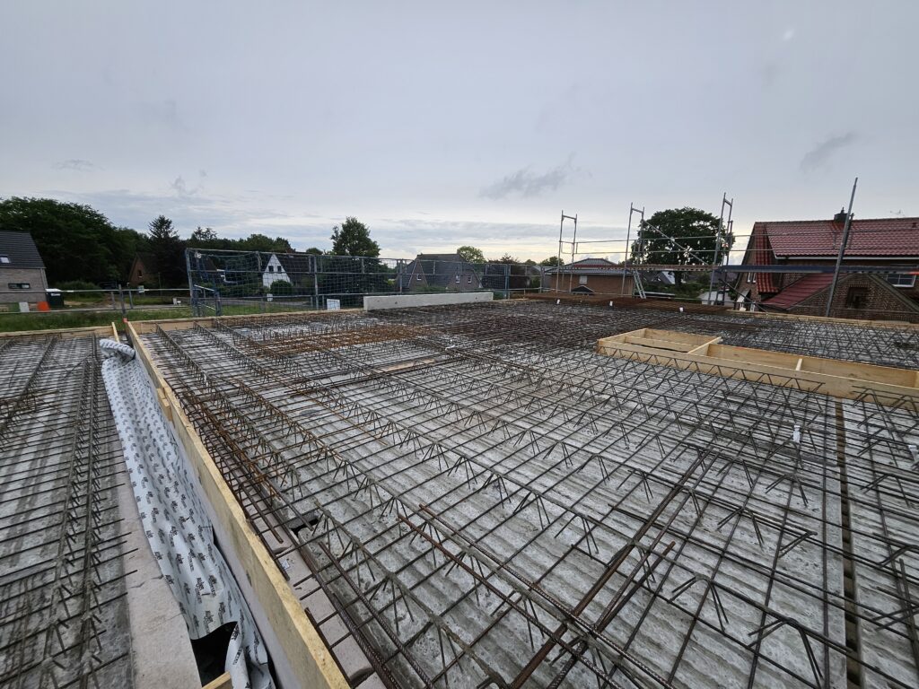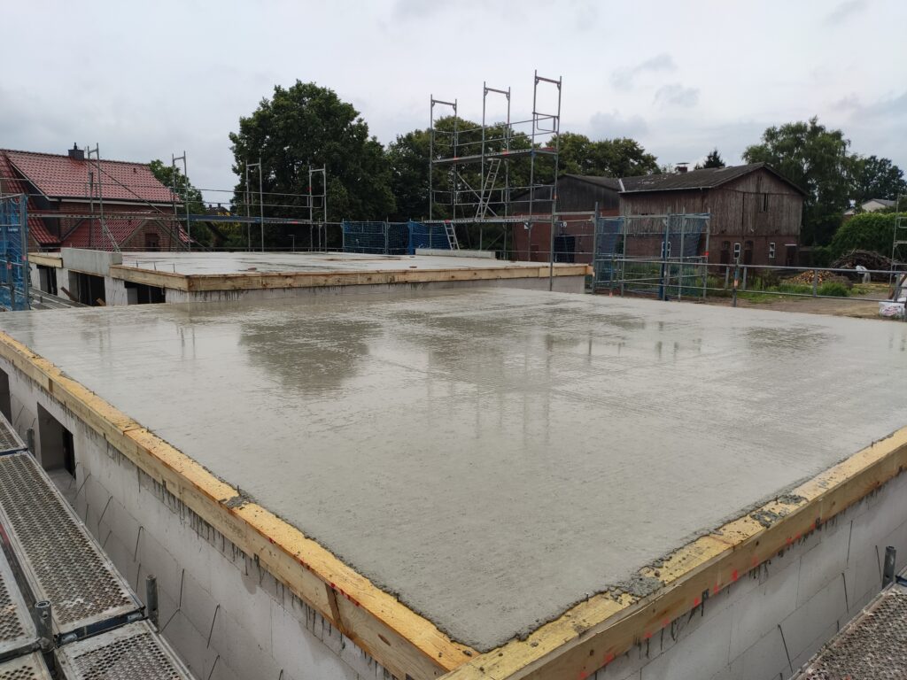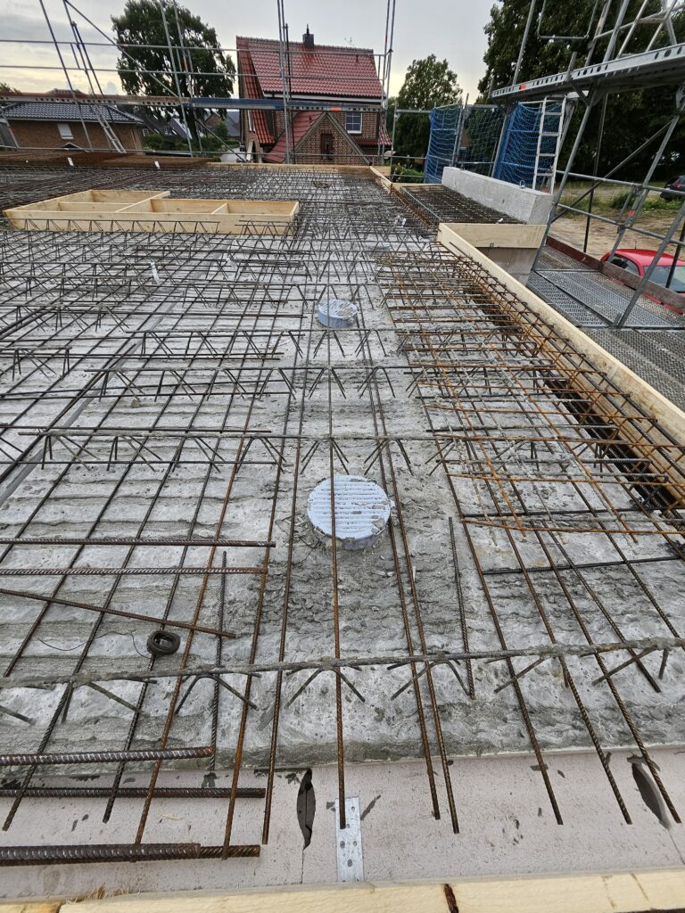 Nachdem am Montag die Decke geliefert und alle Vorarbeiten erledigt waren (z. B. Verschalung und Bewehrung), konnte am Dienstag, den 22.07.2025, endlich der Beton für die EG-Decke und die Garage gegossen werden. Ein großer Schritt nach vorne!