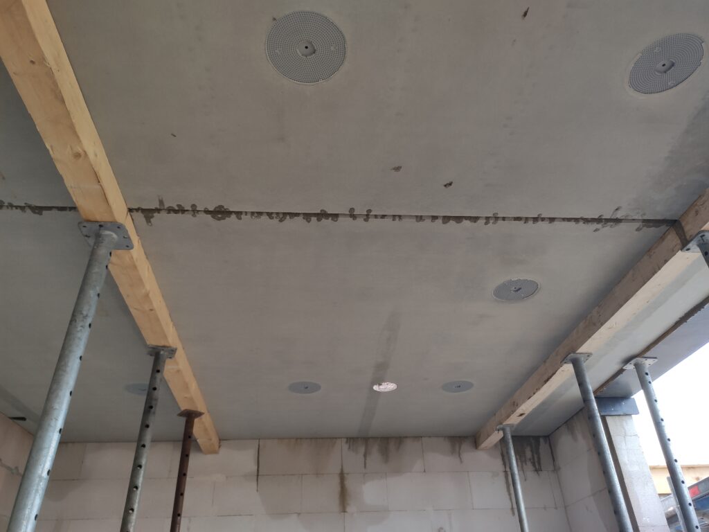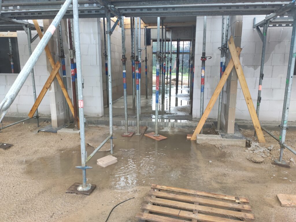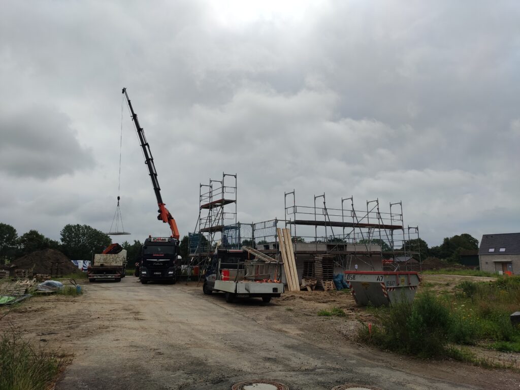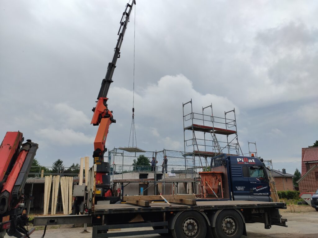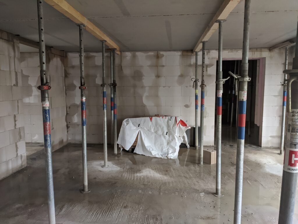 Diese Woche stand ganz im Zeichen der Filigrandecke und was soll ich sagen: Es war ein Spektakel, das ich mir nicht entgehen lassen konnte. In meiner 20-minütigen Pause bin ich schnell zur Baustelle gefahren und habe mir angeschaut, wie die vorgefertigten Deckenplatten per Kran millimetergenau auf die Hausmauern gesetzt wurden. Faszinierend zu sehen, wie jede Platte ihren Platz findet! Gleichzeitig wurden von unten die nötigen Stützpfeiler aufgebaut.