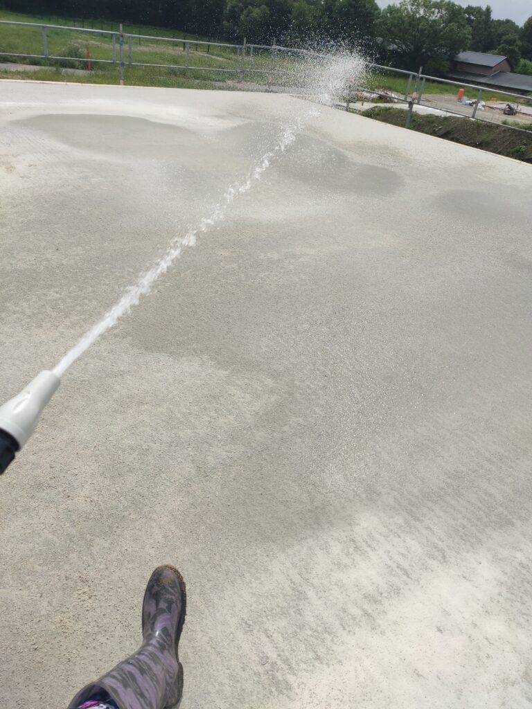 Am Donnerstagmorgen musste ich mit Erschrecken feststellen, dass die Decke über Nacht schon wieder fast komplett trocken war. Also hieß es für mich ab Donnerstag bis Samstag wieder: zweimal täglich wässern; morgens und abends. Beton braucht eben Liebe… und Wasser. 😄