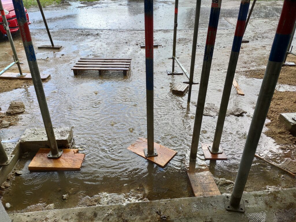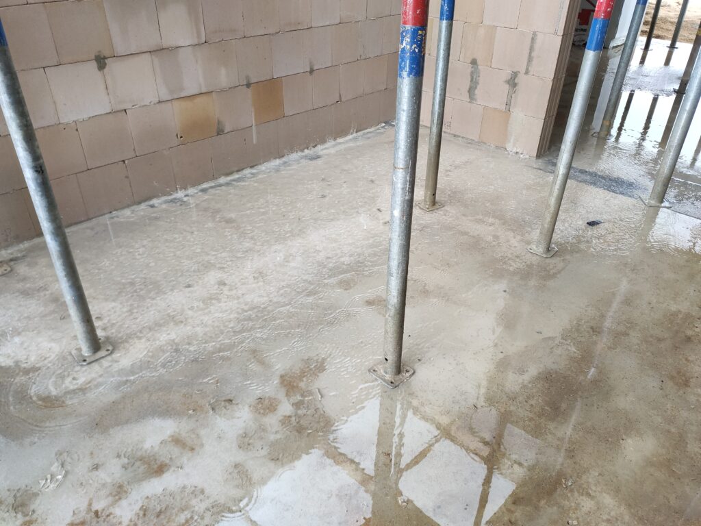 Es hat in dieser Woche dermaßen geregnet, dass unser Erdgeschoss streckenweise mehr an ein Planschbecken erinnerte. Wasserlachen überall, zum Glück nur ein vorübergehendes Ärgernis. Wir nehmen’s mit Humor: Immerhin war das mal ein echter „Wasser-Test“ für den Rohbau! 😄