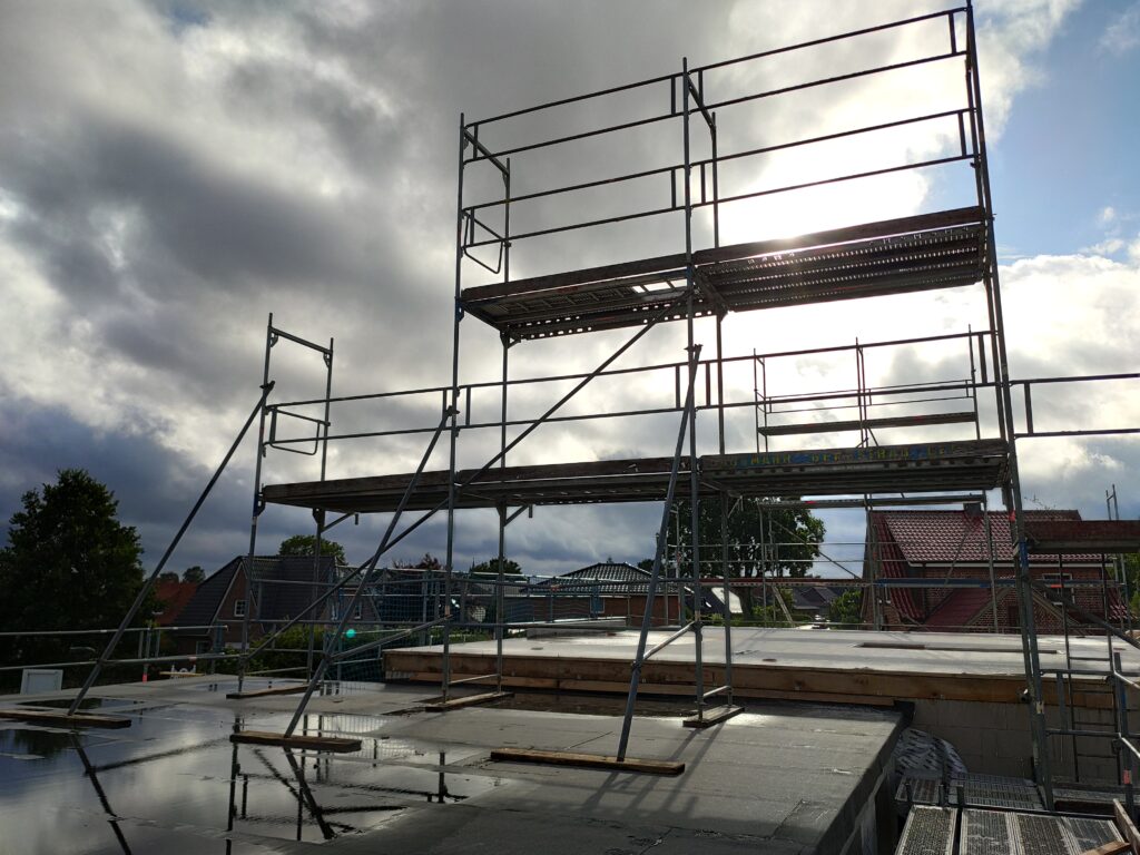Am Dienstag wurde das Garagendach abgeschweißt. Am Donnerstag rückten die Gerüstbauer an und erweiterten das Gerüst, unter anderem auf dem Garagendach. Alles in Vorbereitung für das, was in der kommenden Woche ansteht.