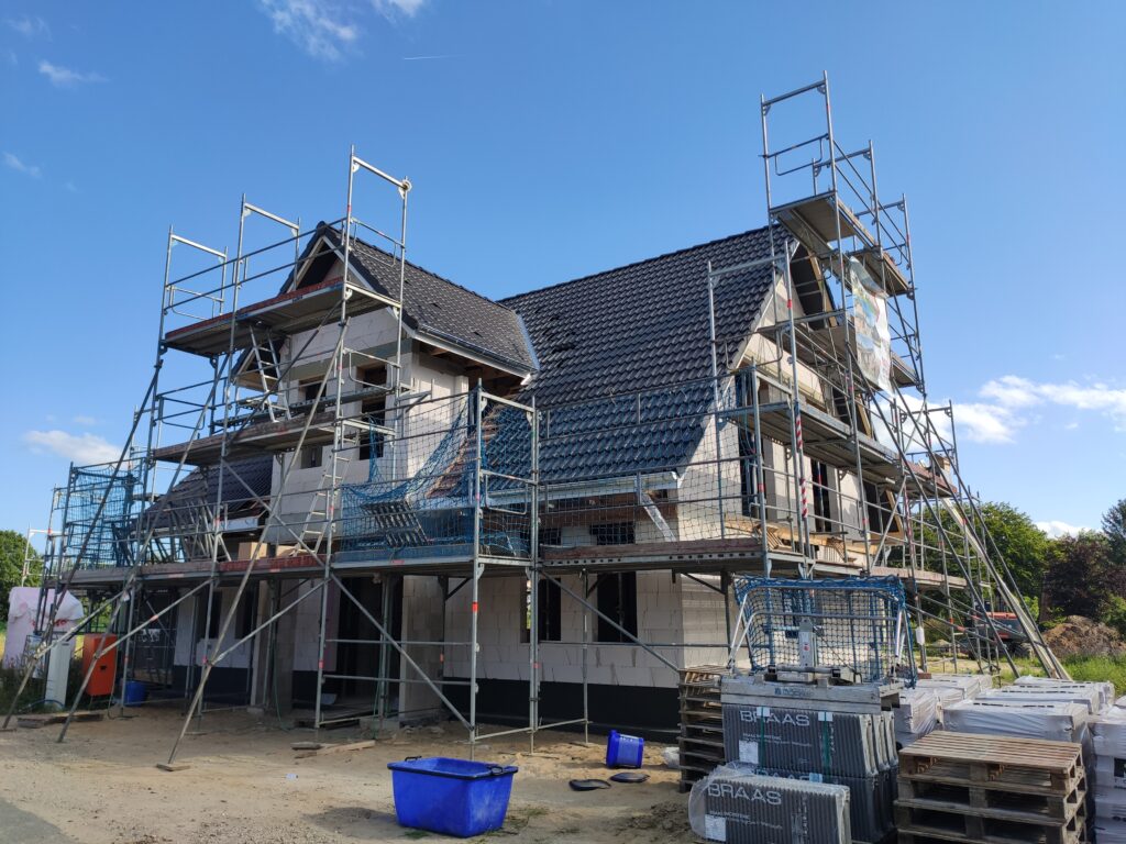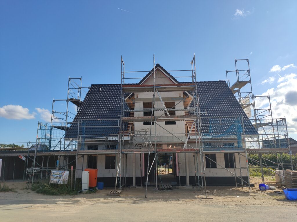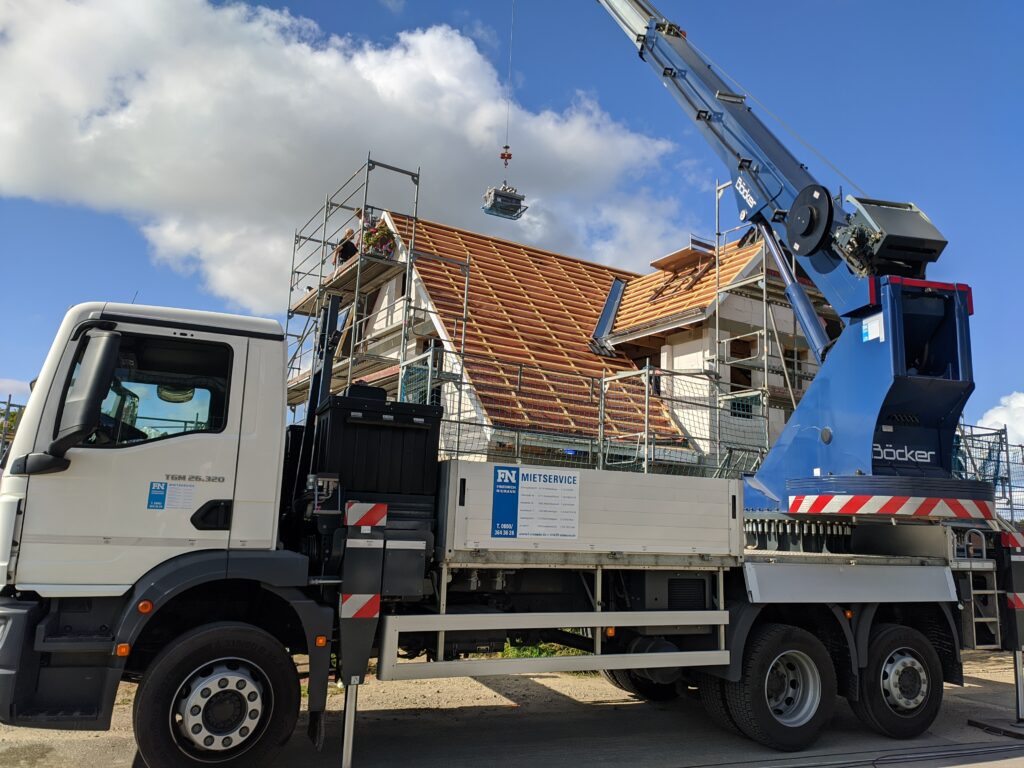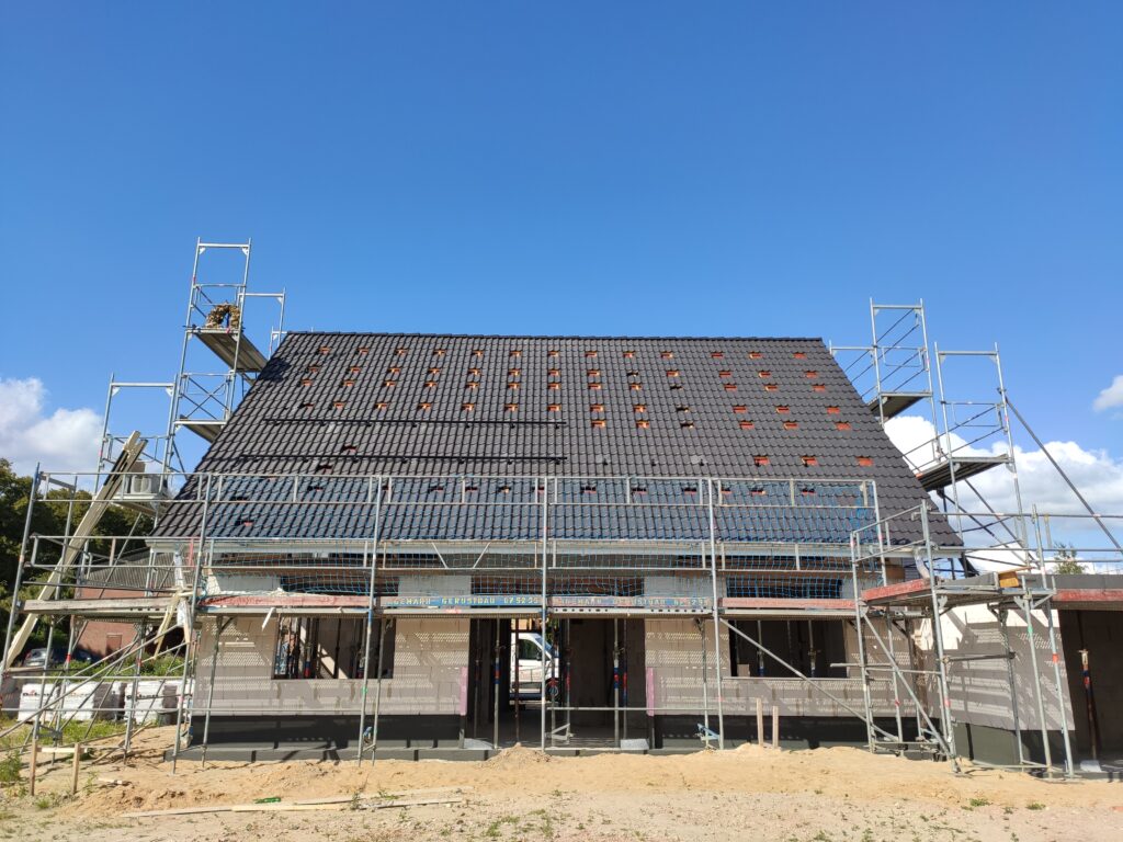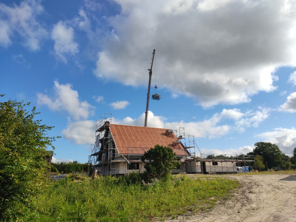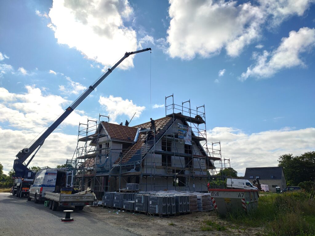 Heute war ein sechsköpfiges Team der Dachdeckerei Jan Witt auf unserer Baustelle im Einsatz. Mit einem Kran wurden die Dachpfannen auf unser Dach befördert und in beeindruckender Geschwindigkeit das Dach eingedeckt.