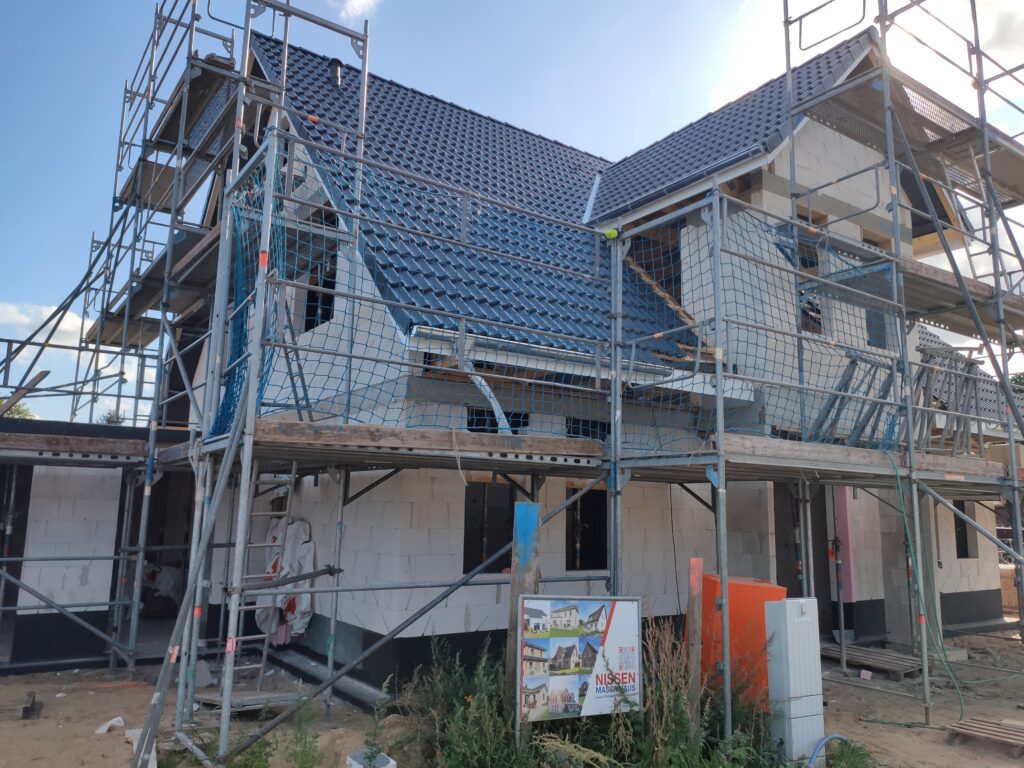 Am Kapitänsgiebel klafft noch eine Lücke, da dort zunächst der Verblendstein hochgezogen werden muss. Auf der Südseite wurden bereits erste Vorbereitungen für das Schienensystem der geplanten Solaranlage getroffen. Einige Stellen wurden dabei bewusst offen gelassen, um die Arbeiten morgen fortsetzen zu können.