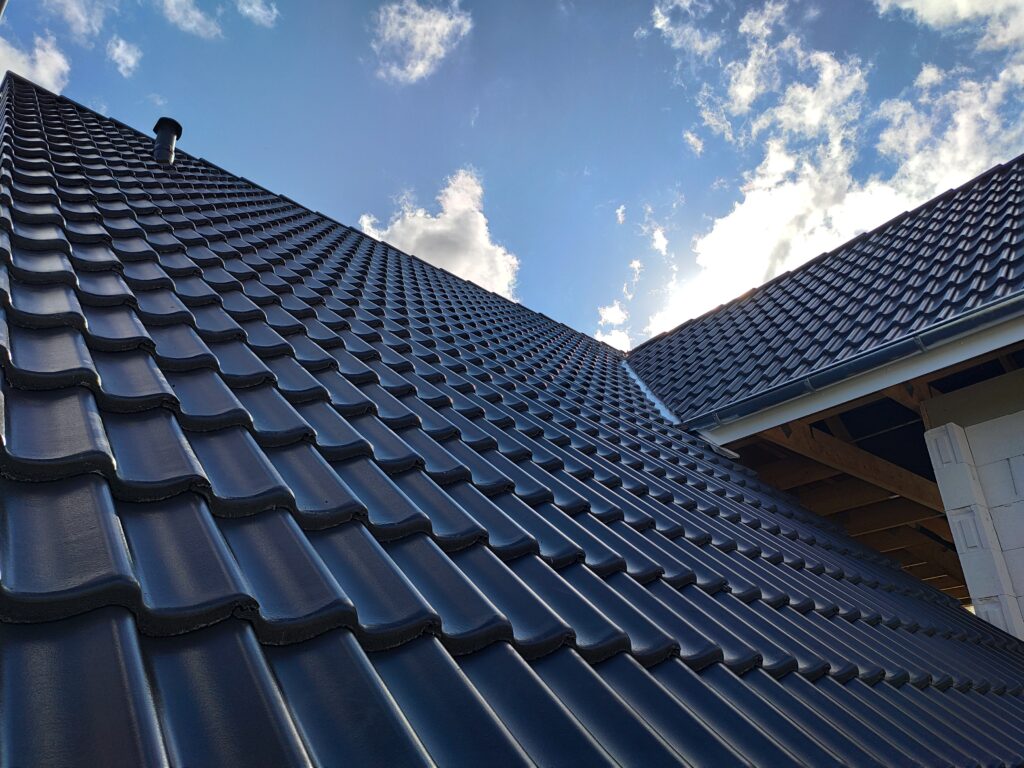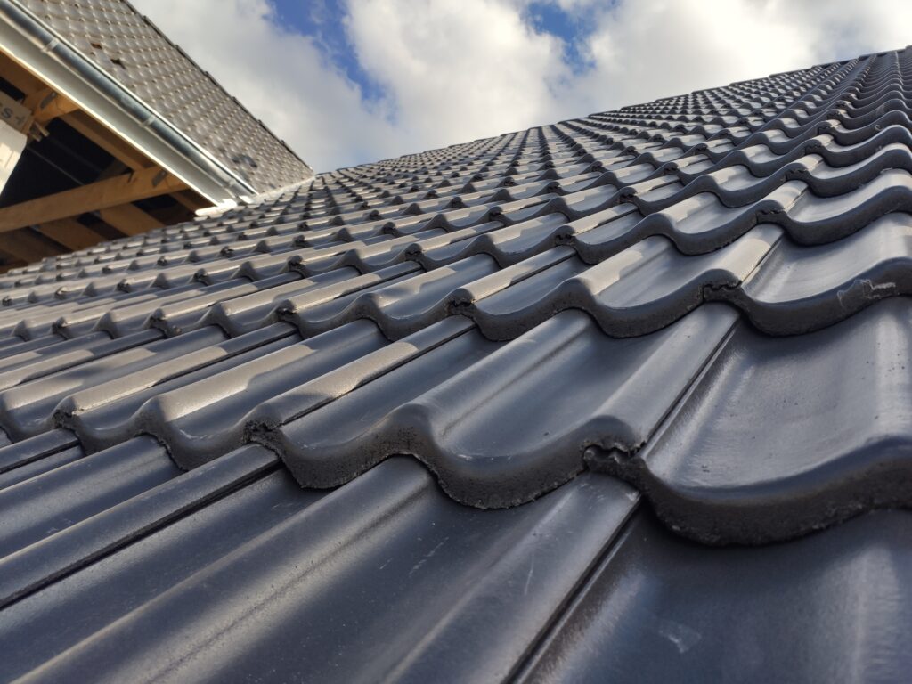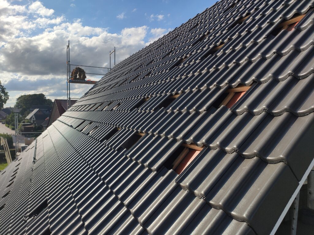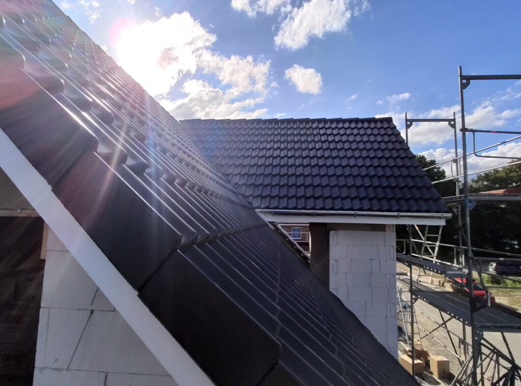 Bei den Dachpfannen fiel unsere Wahl auf die Braas Doppel S in Starmatt . Mit dem Ergebnis sind wir super zufrieden. So präsentiert sich unser Dach bereits nach einem Tag Arbeit: