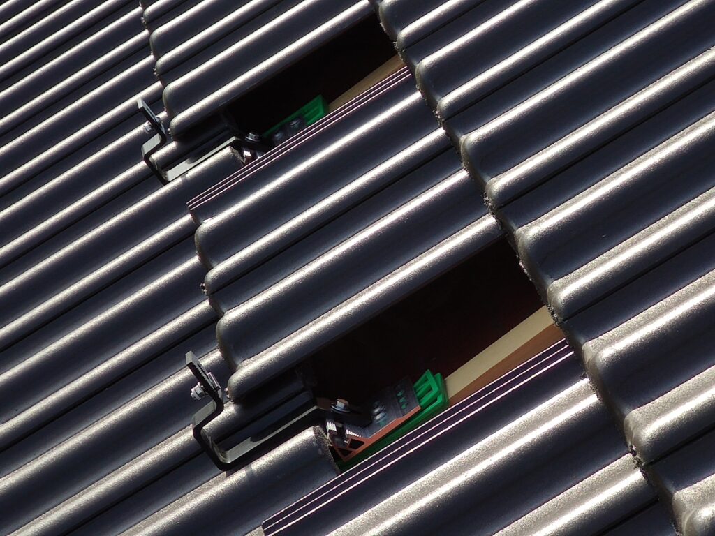 Auf dem rechten Bild erkennt man die grünen Abstandshalter: Sie sorgen dafür, dass die Halterungen nicht direkt auf den Dachpfannen aufliegen und somit keine Schäden entstehen.